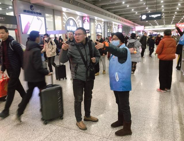 春运期间,火车站里还有不少特殊人群需要帮助。一位拎着大包小包的老年人,独自一人出站,显得有些无助。小王主动上前询问,得知她的家人正在停车场等他。小王推着老人家的行李,一路送她到停车场,找到了家人。还有很多人从车库过来接朋友或者家人,不确定需要在哪里等候。小王就整理了一套标准回答,让他们确认好车次对应的出站口,约定北出口等待,就可以享受重逢的喜悦了。